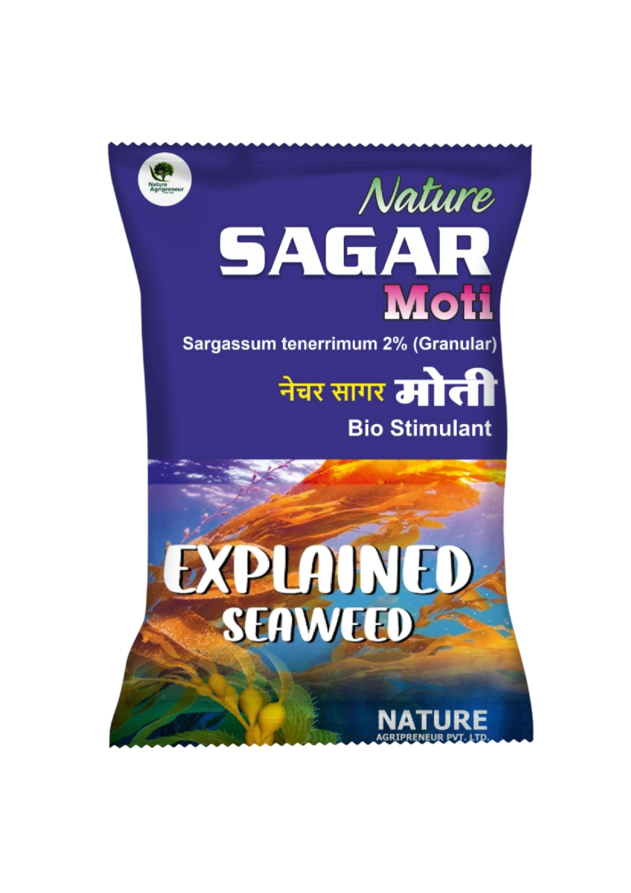 NATURE SAGARMOTI एक उन्नत समुद्री शैवाल (Seaweed) आधारित बायो-स्टिमुलेंट है, जिसमें Sargassum tenerrimum 2% ग्रैन्युलर फॉर्म में शामिल है। यह पौधों की जैव-क्रियाओं को सक्रिय करता है, जड़ों की वृद्धि को प्रोत्साहित करता है और फसलों में फूल व फल विकास को बेहतर बनाता है। इसके नियमित उपयोग से पौधों की ताकत, हरियाली और उत्पादन क्षमता में वृद्धि होती है।